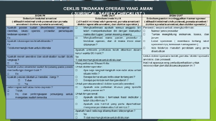 BEBERAPA PROSEDUR YANG TIDAK MEMERLUKAN PENANDAAN: Kasus organ tunggal (misalnya operasi jantung, operasi caesar) Kasus intervensi seperti kateter jantung Kasus yang melibatkan gigi Prosedur yang melibatkan bayi prematur di mana penandaan akan menyebabkan tato permanen kasus dimana secara teknik atau anatomi sulit untuk memberi penandaan lokasi operasi, misalnya : penandaan pada kasus crush injury, penandaan untuk daerah sensitif seperti scrotum, payudara. kasus emergensi (life-threatening) yang membutuhkan operasi cito/emergensi. 31