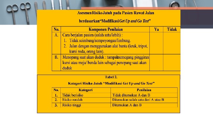Pencegahan resiko Jatuh • Pencegahan Umum (Edukasi, orientasi, posisikan nyaman, pencahayaan adekuat, lantai tidak licin, pemasangan pengaman dll) • Pencegahan Resiko Tinggi Jatuh (berikan ident alert, berikan penanda di tempat tidur, observasi 2 -3 jam)