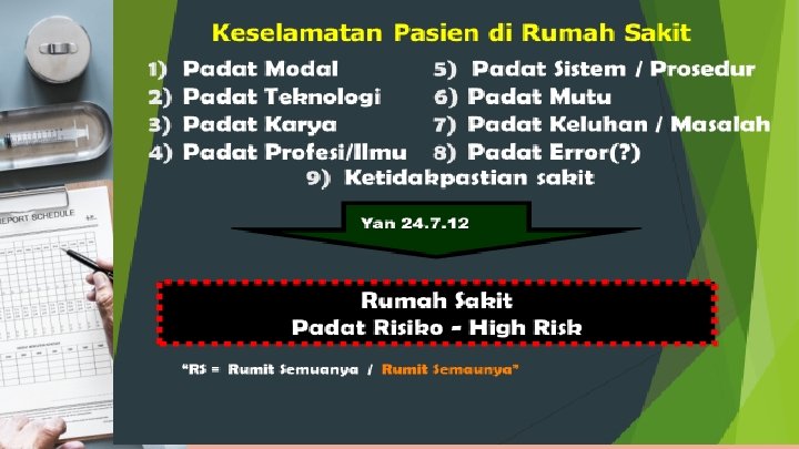 Implementasi Keselamatan Pasien * 7 LANGKAH MENUJU KESELAMATAN PASIEN RUMAH SAKIT 1. Bangun kesadaran akan nilai Keselamatan Pasien, 2. Pimpin dan dukung staf anda, 3. Integrasikan aktivitas risiko, 4. Kembangkan sistem pelaporan, 5. Libatkan dan berkomunikasi dengan pasien, 6. Belajar dan berbagi pengalaman tentang KP, 7. Cegah cedera melalui implementasi sistem KP *7 STANDAR KESELAMATAN PASIEN RS & AKREDITASI YAN KPRS I. Hak pasien, II. Mendidik pasien dan keluarga, III. Keselamatan pasien dan Asuhan Berkesinambungan, IV. Penggunaan metoda peningkatan kinerja, utk melakukan evaluasi & meningkatkan KP, V. Peran kepemimpinan dalam meningkatkan KP, VI. Mendidik staf tentang KP, VII. Komunikasi merupakan kunci bagi staf untuk mencapai KP *WHO – PATIENT SAFETY – 13 ACTION AREAS 1)Global Patient Safety Challenge, 2)Patients for PS, 3)Research for PS, 4)International, Classification for PS, 5)Reporting and Learning PS, 6)Solutions for PS, 7)High 5 s, 8)Technology for PS, 9)Knowledge Management on PS, 10)Eliminate central line-associated bloodstream infections, 11)Education for Safer Care, 12)The Safety Prize, 13) Medical Checklist *6 SASARAN KESELAMATAN PASIEN RUMAH SAKIT