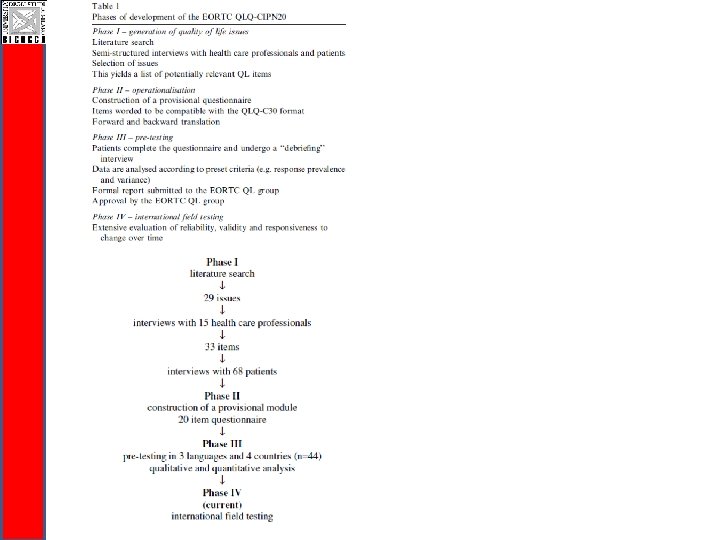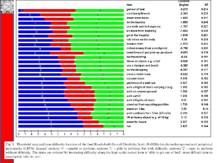 CI-Perinoms CI-Peri. Noms Study questionnaire development q Item generation: Literature review - WHO ICF q Pre-phase Rasch-built Overall Disability Scale: 146 activity and participation items q Pre-phase R-ODS was assessed twice (testretest) q Rasch unidimensional measurement model (RUMM 2030)