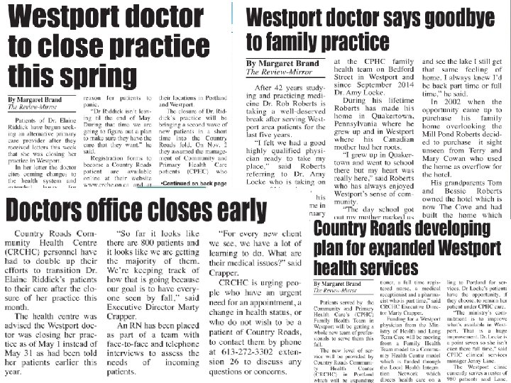 Objectives Given the certainty that every provider will eventually retire and that every patient will experience provider transition……. . • Share the experiences of managing the transition of care for patients in Rideau Lakes Township and the village of Westport over the past 10 years • Reflect on three provider retirement “types” and the variables that might result in higher patient satisfaction • Recommend approaches for funders, physicians and patients that could be used when we are faced with physician retirements in the future