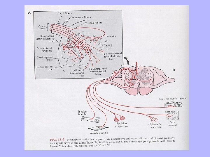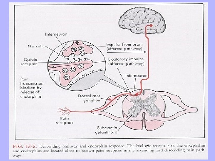 1. Inhibícia prenosu bolestivej informácie na úrovni miechových segmentov • Na tejto úrovni sú inhibované hlavne silné bolestivé podnety prichádzajúce z periférnych tkanív • Intenzívna bolestivá informácia prichádzajúca do zadného rohu miechy vyvolá, okrem depolarizácie druhého neurónu bolestivej dráhy, aj uvolnenie endogénnych opioidov, ktoré cez opioidné receptory inhibujú prevod bolestivej informácie Inhibícia sa uskutočňuje na presynaptickej úrovni