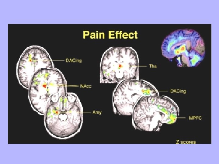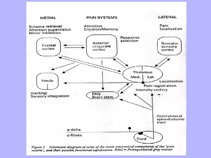 Spracovanie bolestivej informácie na centrálnej úrovni • Stále existujú nejasnosti v tom, ktoré oblasti mozgu (a miechy) sa podieľajú na spracovaní bolestivej informácie • Existujú dôkazy o tom , že bolestivá informácia je spracovaná v sieti štruktúr mozgu (matrix), teda nie v presne definovanom centre bolesti
