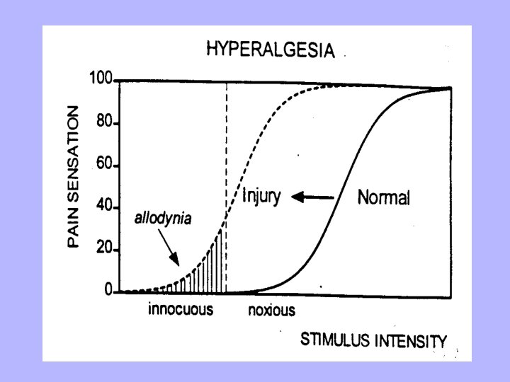 Hypersenzitivita, hyperalgézia a allodýnia Hypersenzitivita (HS) – zvýšená citlivosť systémpodieľajúceho sa na vzniku bolesti Hyperalgézia (HA) – zosilnenie pocitu bolesti na bolestivé podnety Allodýnia (ALL) – vznik bolesti na podnety za normálnych podmienok nebolestivé • HA a ALL sú výsledkom posunu krivky vyjadrujúcej vzťah medzi intenzitou stimulu a pociťovaním bolesti (pozri obr) • HA a ALL sú ochrannými mechanizmami organizmu proti atakovaniu poškodeného tkaniva a tým napomáhajú jeho rýchlejšiemu zhojeniu