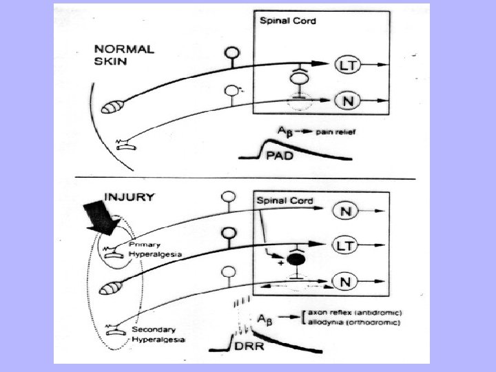 - vznik ektopických generátorov tvorby „Cross-talk“ medzi somatickými nerv. vláknami vzruchov na poškodených nervových vláknach - expresia adrenergných receptorov na nociceptívnych n. vláknach - uvolnenie zápalových mediátorov citlivosti n. vlákien - zmena fenotypu n. vlakien: A beta A delta (neuroplasticita) - vznik nových typov receptorov na n. vláknach: napr. VR 1 - zmena vodivosti n. vlákien na základe zmeny funkcie iónových kanálov Zhojený axón
