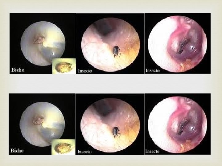 Patología del Oído externo Cuerpo extraño en el CAE Tratamiento: Como en tapón de cerumen. Los insectos es necesario matarlos antes de intentar la extracción ya que clavan los espolones de sus patas en la piel de las paredes del CAE. (Llenando el conducto de alcohol). En casos difíciles IQ.