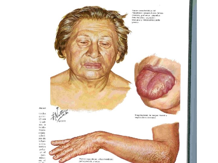 HIPOTIROIDISMO clínica Ø Cuadro general: Astenia, apatía, intolerancia al frío, ganancia de peso, aspecto mixedematoso (abotargado), edema palpebral, piel seca y descamativa, pálido-amarillenta (tinte carotinoide). Pelo seco y áspero, caída de pelo sobretodo en “cola de cejas”. Voz grave, ronca. Ø Sistema Nervioso y Neuromuscular: Letargia, depresión, somnolencia, ataxia cerebelosa, calambres, sd túnel carpiano, disminución de la memoria, y de la atención, bradilalia, demencia, parestesias, hiporreflexia Ø Sistema Cardio-respiratorio: Disminución tolerancia al ejercicio, bradicardia, derrame pleural, derrame pericardico, disnea de esfuerzo. Ø Sistema digestivo: Estreñimiento, macroglosia, nauseas, ascitis Ø Sistema Reproductor: Alteraciones menstruales, disminución de la libido y fertilidad