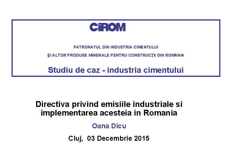 PATRONATUL DIN INDUSTRIA CIMENTULUI ŞI ALTOR PRODUSE MINERALE PENTRU CONSTRUCŢII DIN ROM NIA Studiu de caz - industria cimentului Directiva privind emisiile industriale si implementarea acesteia in Romania Oana Dicu Cluj, 03 Decembrie 2015