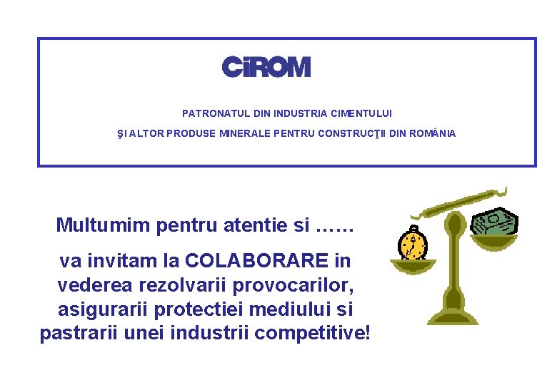 PATRONATUL DIN INDUSTRIA CIMENTULUI ŞI ALTOR PRODUSE MINERALE PENTRU CONSTRUCŢII DIN ROM NIA Multumim pentru atentie si …… va invitam la COLABORARE in vederea rezolvarii provocarilor, asigurarii protectiei mediului si pastrarii unei industrii competitive!