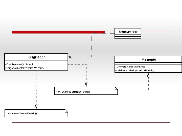 Memento: Almacena el estado interno del objeto Originator, protege del acceso por parte de objetos distintos al Originator. • Originator: crea un objeto memento, que contiene una foto fija de su estado interno. • Caretaker: es el responsable de mantener la seguridad del objeto memento, no opera o examina el contenido de memento