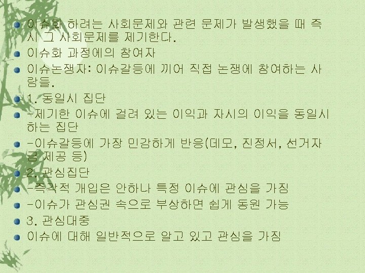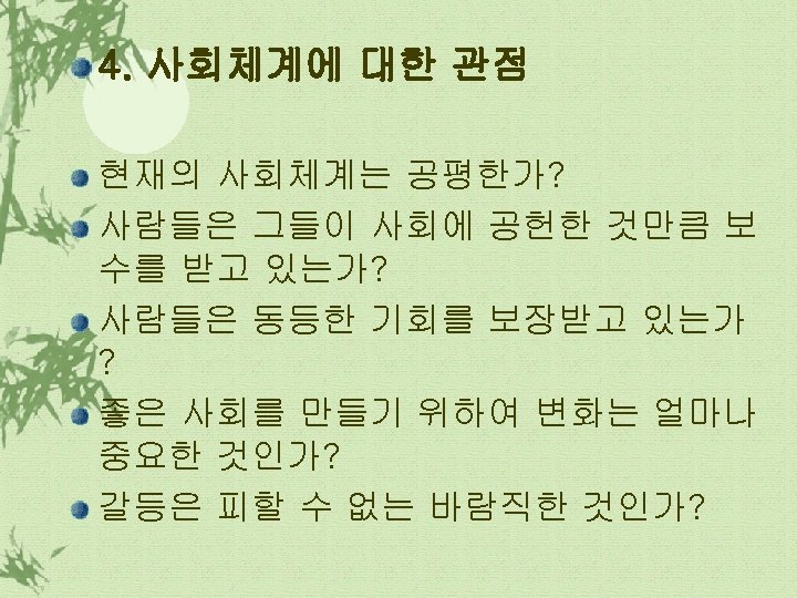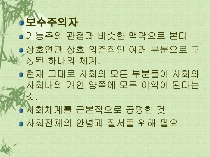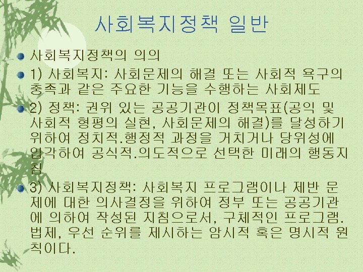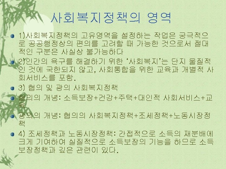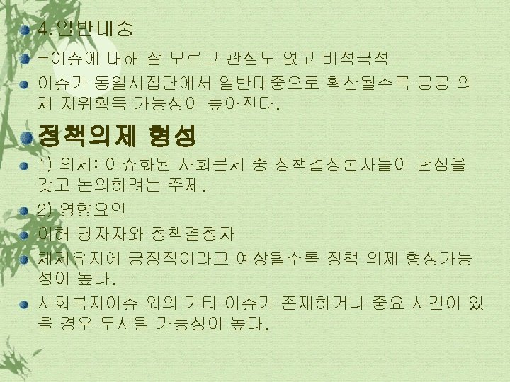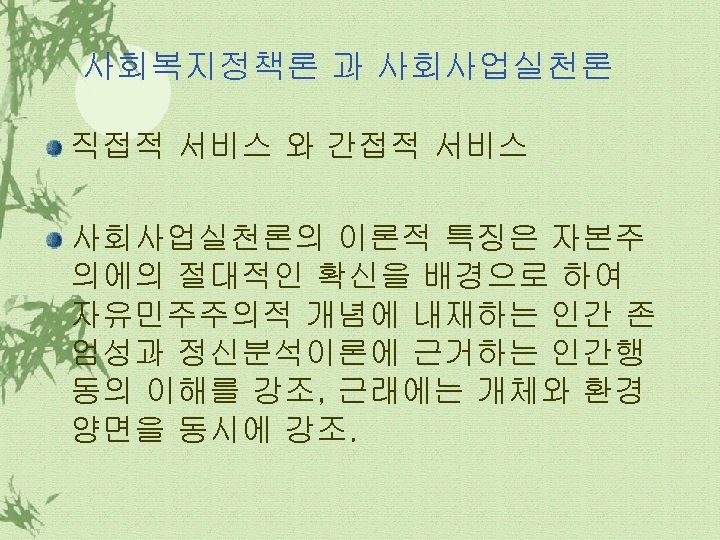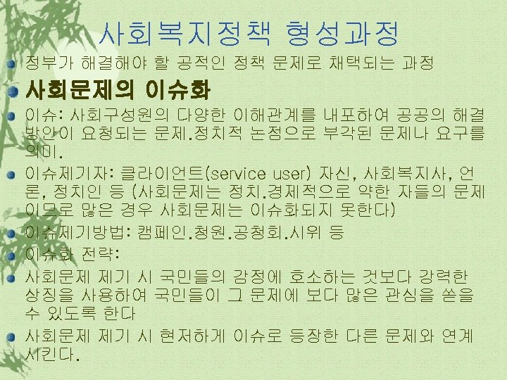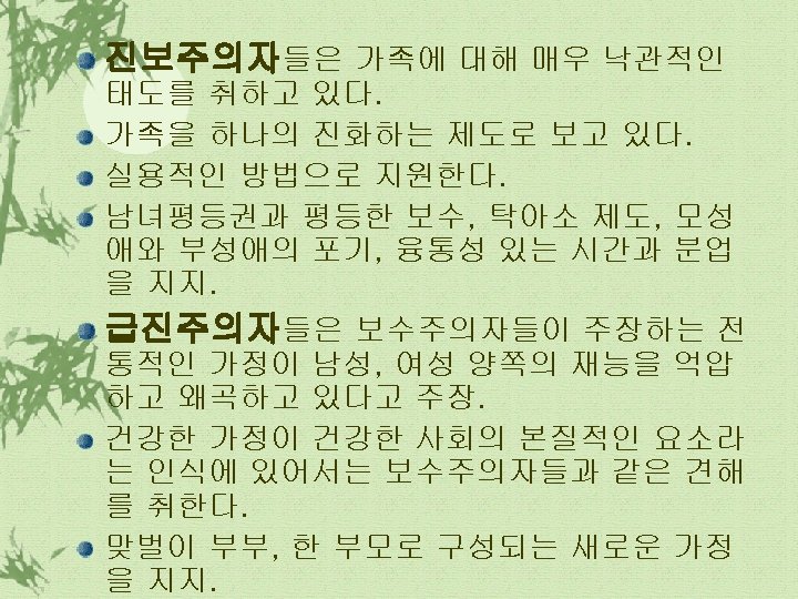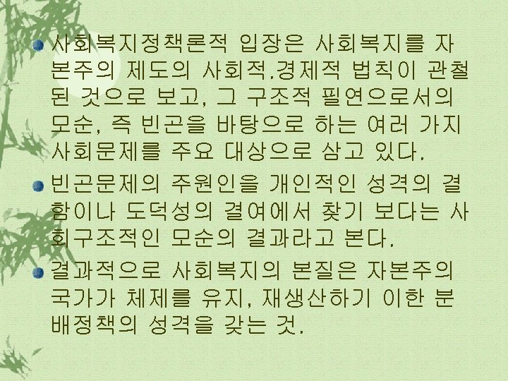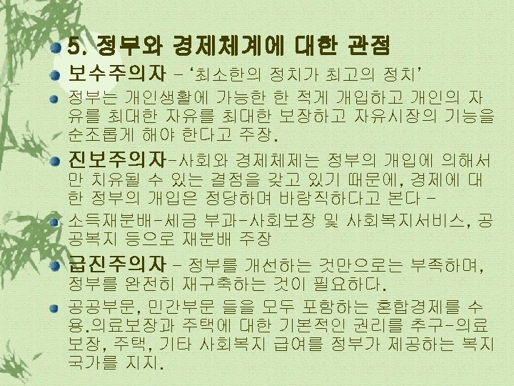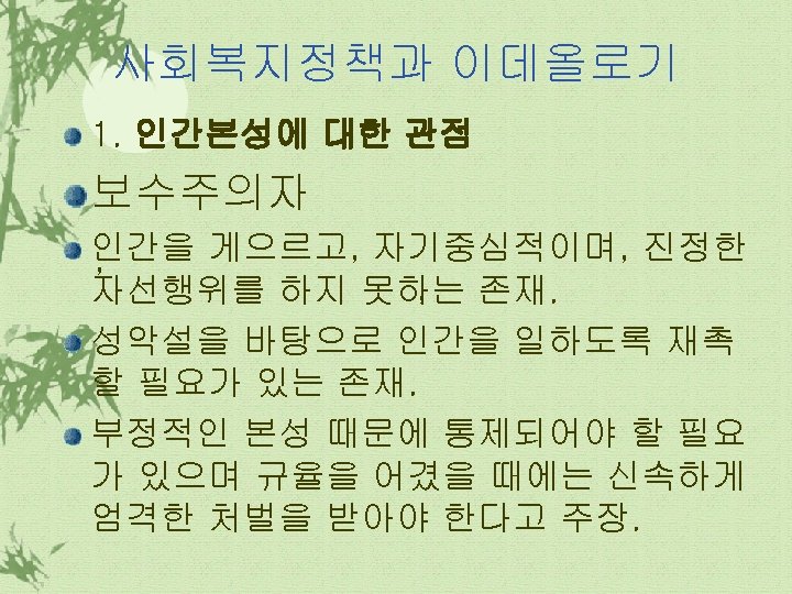 이데올로기에 따른 사회복지정책의 내용 Ideologies of Welfare The New Right The Middle Way Democratic Socialism Marxism Feminism Greenism