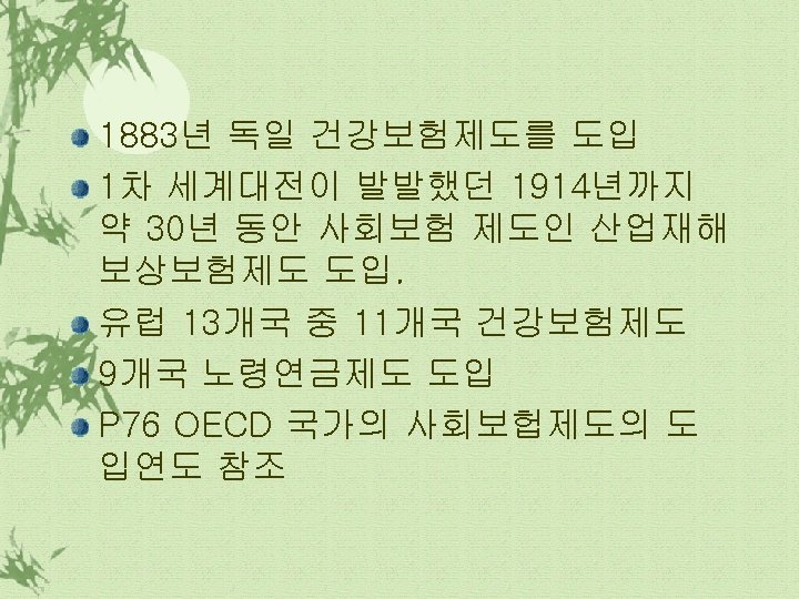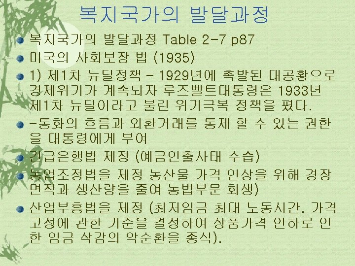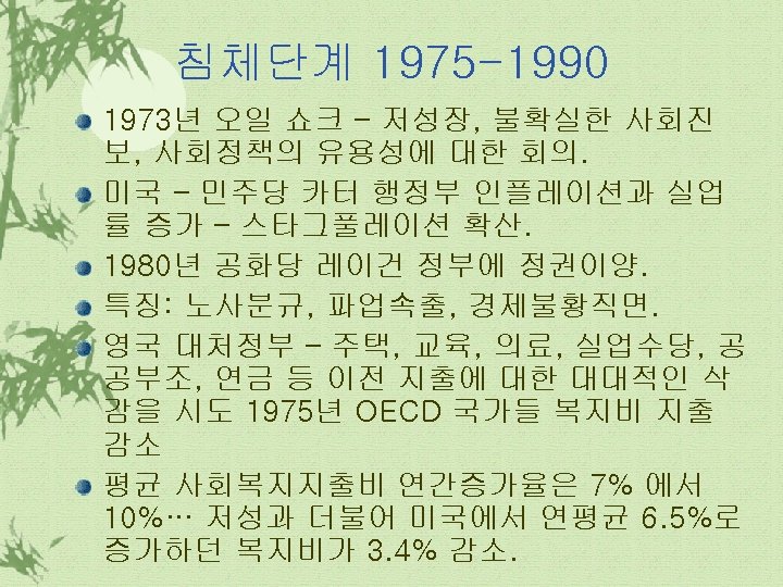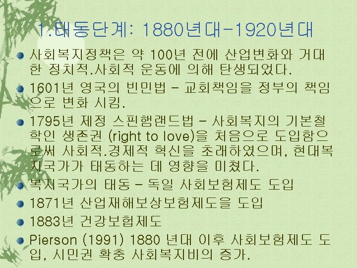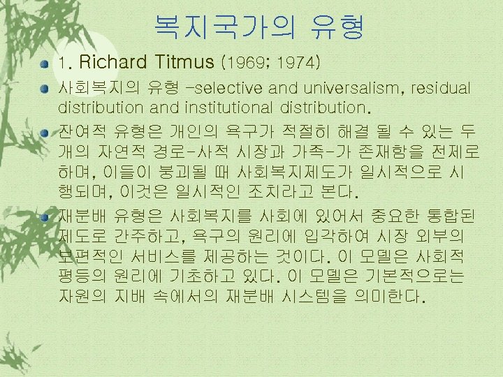 Pattern of Welfare State Titmuss Model 1969; 1974 Furniss and Tilton 1977 Mishra 1984 Esping Andersen 1990 복지국가 유형 분류의 한계 복지국가의 발전단계 태동단계: 1880 -1920 정착단계: 1920 -1945 성장단계: 1945 -1975 침체단계: 1975 -1990 재편단계: 1990