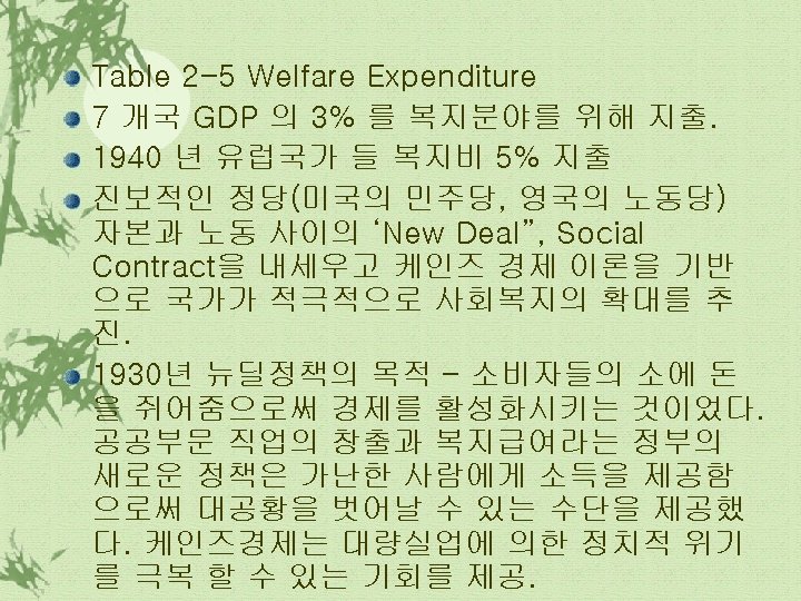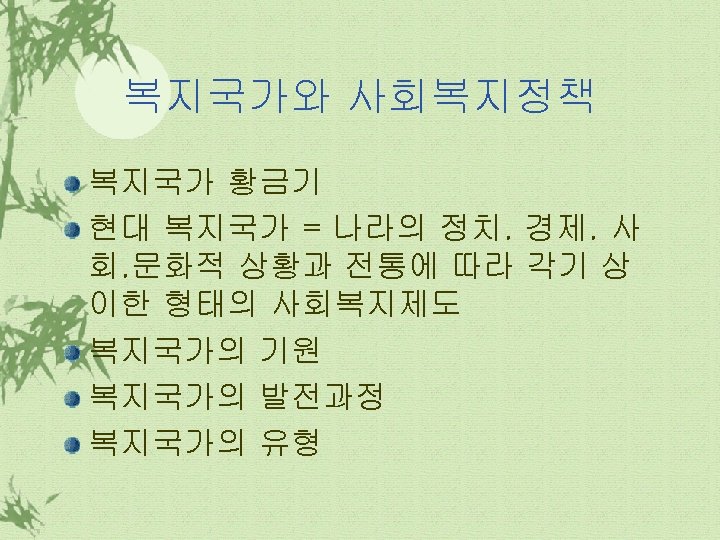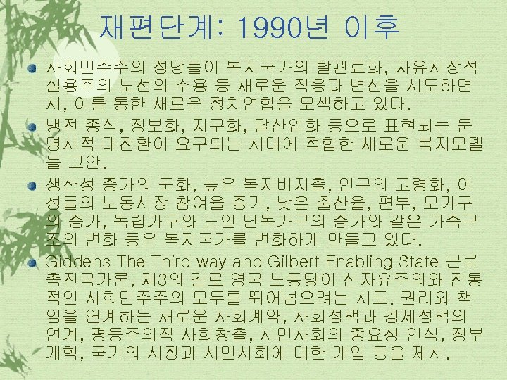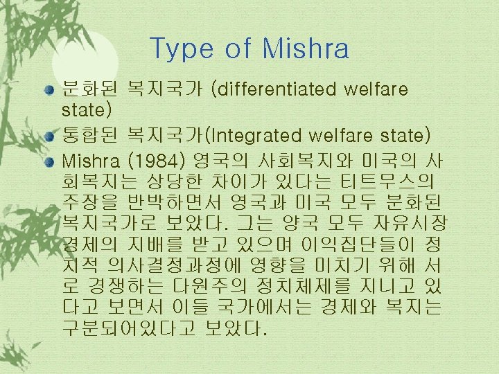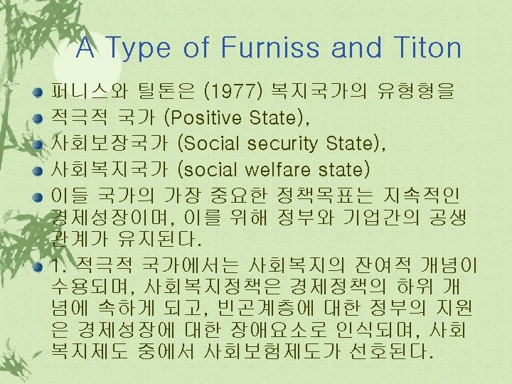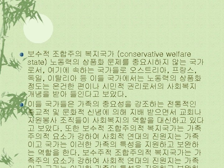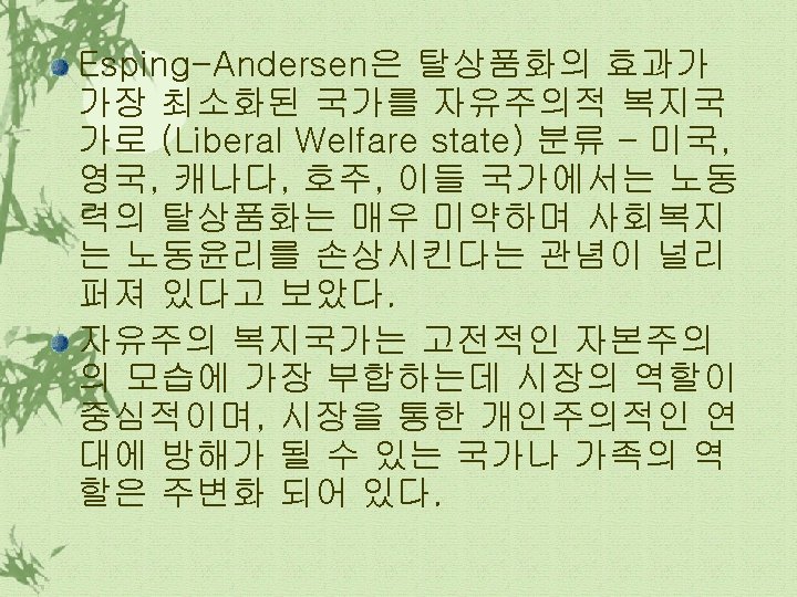 Type of Esping-Andersen 은 decommodification 의 정도, 계층화 (stratification) 유형, 국가와 시 장의 상대적 비중이라는 세가지 기준을 사용 하여 복지국가를 분류 하였다. Liberal welfare State (자유주의 복지국가) Conservative-corporative welfare state (보수적 조합주의 복지국가) Social democratic welfare state (사회민주 주의 복지국가)