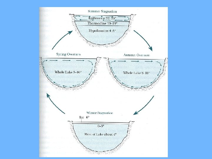Thermal Stratification • Epilimnion: warm surface water • Metalimnion: 0 C changes with depth • Hypolimnion: cold deeper waters • Changes with season