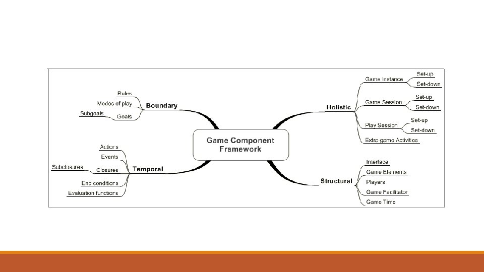 Component categories Holistic −Determine how the activity of playing the game is divided Boundary −Limit the player activities by allowing certain actions and making some activities more rewarding Temporal −Describe the flow of the game play and define the changes in the game state Structural - Define the parts of the game which are manipulated by the players and the