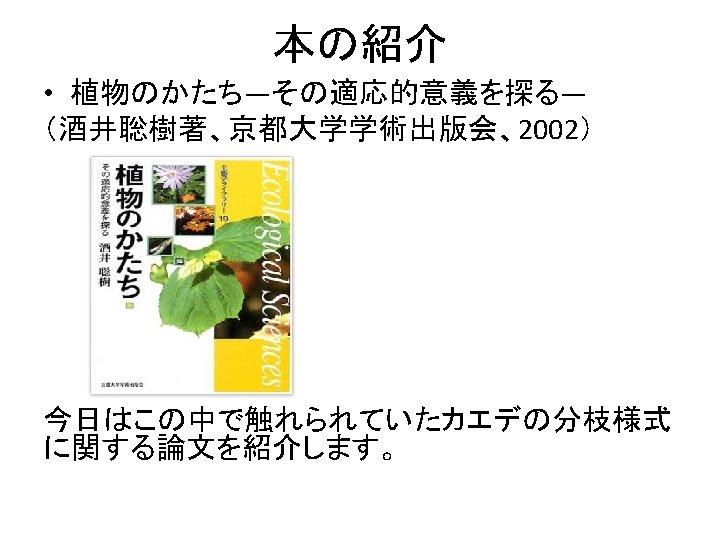 • カエデ類の分枝と拡大成長の様式はとても多様である。 →これらの違いは更新立地の光環境、すなわちギャップ のサイズに関係している? • この論文では分枝と拡大成長の様式がどのように更新 戦略と関わっているかを明らかにする。 • In Japanese Acer species, the pattern of branching and extension growth is very diversified, and these differences assumed to be closely related to differences in gap sizes in which species regenerate. • The purpose of this study is to show the differences in patterns of branching and extension growth of vigorous saplings are related to the differences in regeneration strategies.