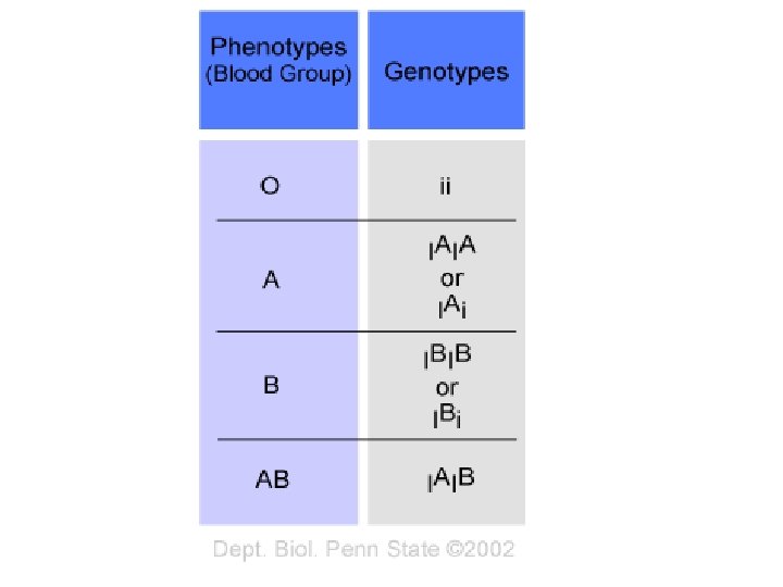 6) Multiple Allele: • Ex: Many codominant alleles in human blood types. • The gene encodes an enzyme that adds sugar molecules to the plasma membrane of red blood cells. Act as recognizing markers for the antibodies for the immune system. • Gene is designated I and has 3 possible alleles. • IA, IB, and i • IA and IB are codominant. • Both I’s are completely dominant over i. Figure out how to get the A, B, AB, and O blood types