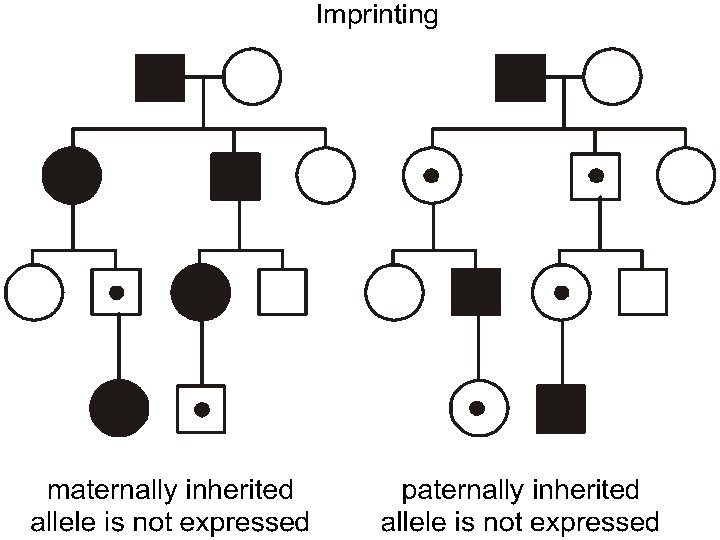 Atypical Patterns of Inheritance In some genetic disorders, the expression of disease phenotype depends on whether the mutant allele has been inherited from the father or from the mother Ø Differences in gene expression b/w the allele inherited from the father and that inherited from the mother are the result of genomic imprinting Ø Imprinting is an alteration in chromatin that affects gene expression but not its DNA sequence. Thus, it is a reversible form of gene inactivation but is not a mutation Ø