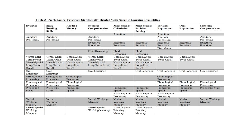 PSW Model: Requires a comprehensive assessment to determine the WHY: Pattern of strengths Otherwise Normal Cognitive Ability Profile Pattern of Weaknesses Academic Deficit(s) Processing Deficit(s) Link identified between the academic and processing deficit