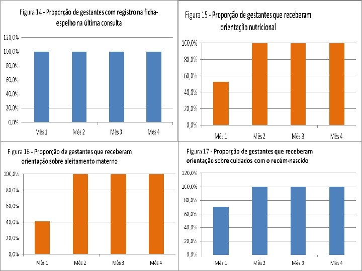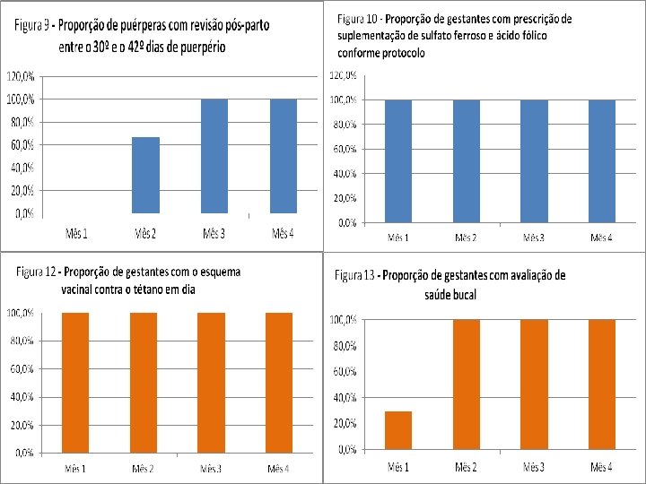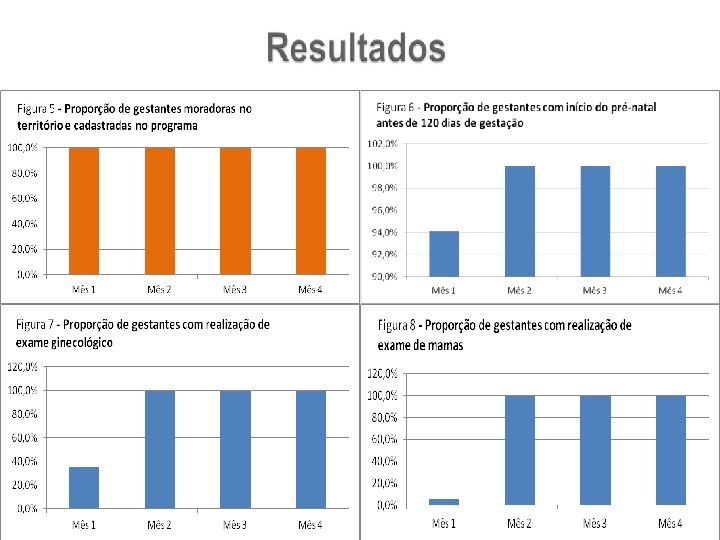 Metodologia - Ações Monitoramento da periodicidade de consultas previstas (100%); do número de mulheres que realizaram exame ginecológico durante o pré-natal (83, 82%); do número de mulheres que realizaram exame de mamas durante o pré-natal (76, 47%); gstantes que fizeram revisão de puerpério (66, 67); fizeram suplementação de ferro/ácido fólico (100%);