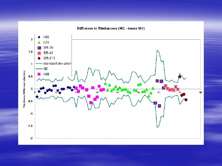 Thickness Comparisons § Seven pavement sections of three interstates. § Pavement sections of three state roads § Five pavement sections of two interstates used for 3 rd party comparison