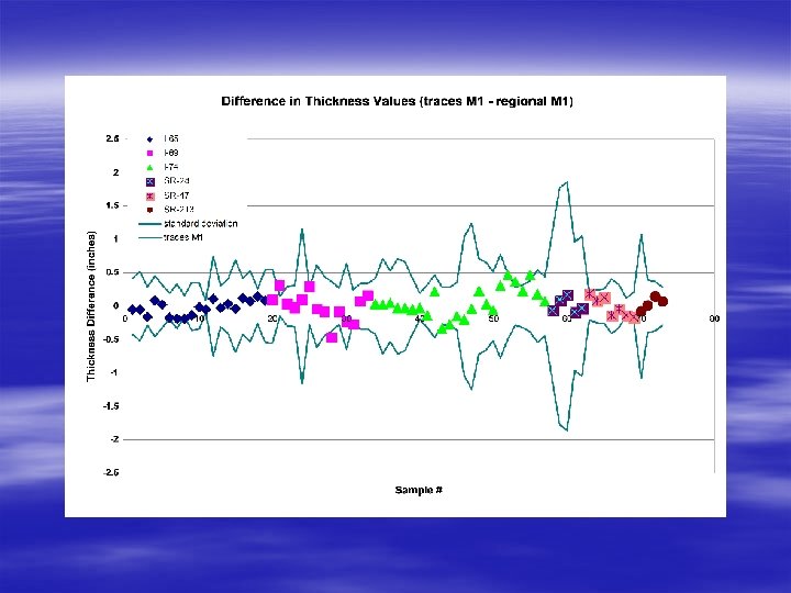 Methodologies for Thickness Evaluation (regional M 1) § Top layer methodology – Discontinuities are located in data – Interfaces are identified in the data – Regional dielectric constants are determined – Thickness values are calculated for each mile – Enhanced to calculate thickness using dielectric constants from individual traces