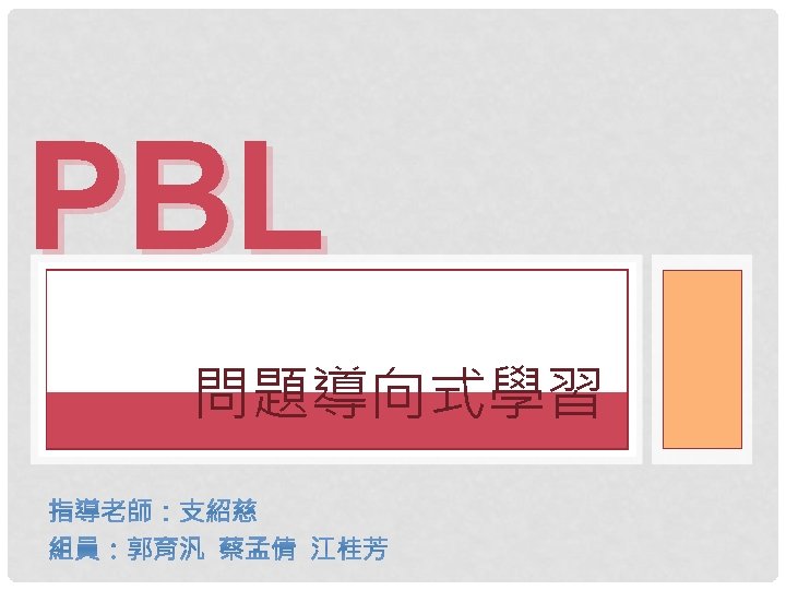 資料來源 PBL • PDF檔 http: //www 3. thu. edu. tw/newsupfiles/new 21165455076. pdf • 數位學習咖啡棧 http: //www. nhcue. edu. tw/~jih/epbl. htm • PBL簡介 http: //tw. knowledge. yahoo. com/question? qid=10050 40701629 • PBL 作坊 http: //140. 138. 35. 106/PBL_web/workshop/index. html • PBL的學習理論 http: //mi. mc. ntu. edu. tw/xms/content/show. php? id=617