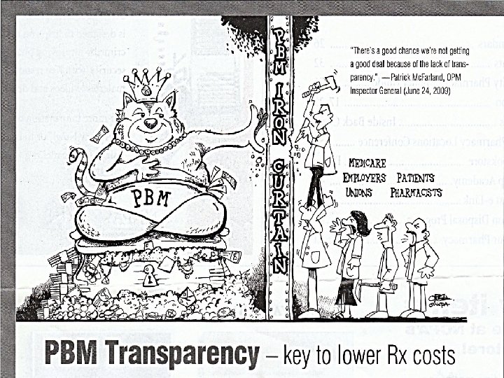 Specialty & Mail Order Drugs: The Myth of Savings…… l PBM’s impact on so-called “Specialty Drugs” – Buying up specialty drug pharmacies making plans think that the PBMs are the only ones that can provide these services - Myth – PBMs getting “exclusive” contracts with specialty drug manufacturer’s which has increased prices exponentially Fact – i. e. One PBM got the exclusive distribution contract on a children’s epilepsy drug (H. P. Acthar Gel) and increased the price from $1, 600 per tube to $23, 000 per tube or 1400%! (See AAI report) - Fact – NYC’s PICA (specialty drug mail order program) costs skyrocketed in the first year. Hundreds of millions in overcharges found in audit and the program split up - Fact