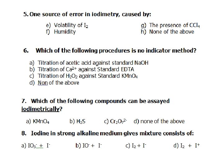 22. H 2 S + I 2 = 23. As. O 33– + I 2 + H 2 O = 24. I 2 + OH– = 25. R – CHO + IO– = 26. S 2 O 32– + I 2 + OH– = 27. KIO 3 + H 3 As. O 3 + HCl (> 4 N ) = 28. KIO 3 + … H 3 As. O 3 + … HCl (0. 1 N)= 29. KIO 3 + KI + HCl (> 4 N ) = 30. KIO 3 + . . KI + . . HCl (0. 1 N ) = 2. Enumerate the head title for: Starch as specific redox indicator cannot be used in the following cases: A) B) C)