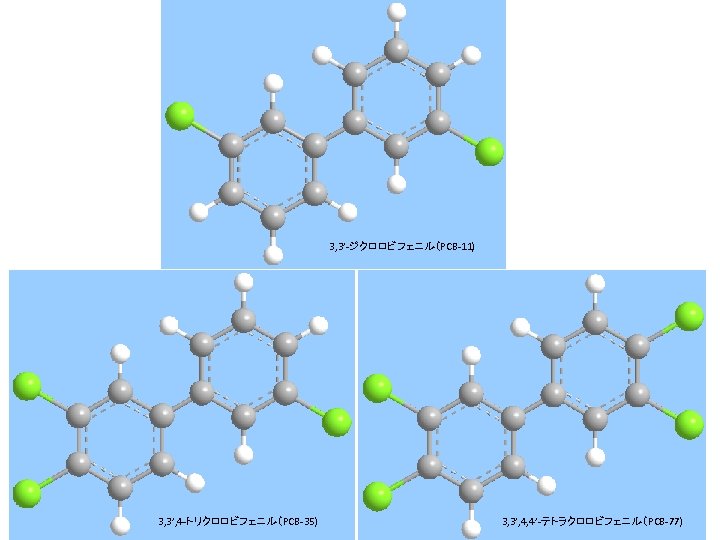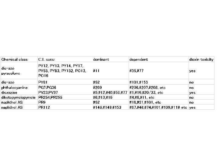 - Results - pigment from 3, 3’-dichlorobenzidine contain #11, #35, #77 - pigment from 2, 2’, 5, 5’-tetrachlorobenzidine contain #52, #101, #153 - pigment from o-chlorobenzene as solvent contain #40, #56, #77 - phthalocyanine-type pigment contain #209, Pe. CBz, HCBz