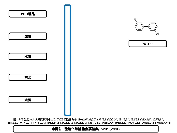 Temp. #11 Di. CBs PCBs 50 40 1400 1200 1000 800 30 600 20 400 PCBs Conc. (pg/m 3) Temperature(o. C), Di. CBs、#11 Conc. (pg/m 3) 60 10 200 0 -10 Apr-05 0 -200 Apr-06 Apr-07 Apr-08 Apr-09 Apr-10 Seasonal variations of PCBs, Di. CBs, and #11 in ambient air ( Sapporo city : April 2005 ~ March 2011) PCBs: 69 -1200 pg/m 3, ave: 361 pg/m 3 #11: 2. 4 -37 pg/m 3, ave: 11. 4 pg/m 3