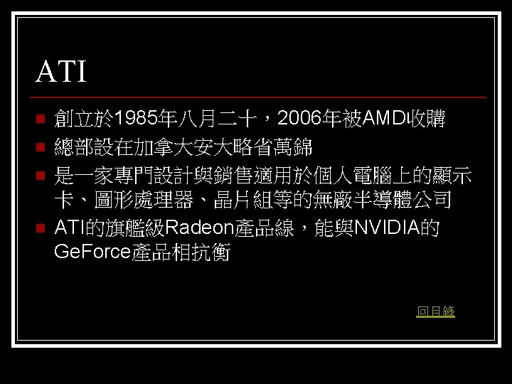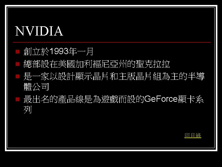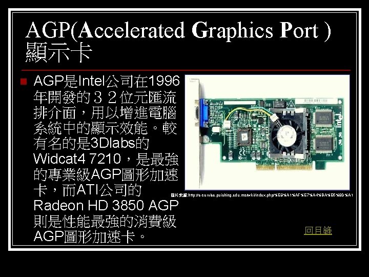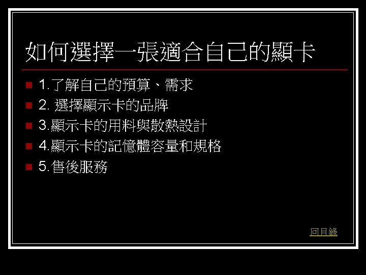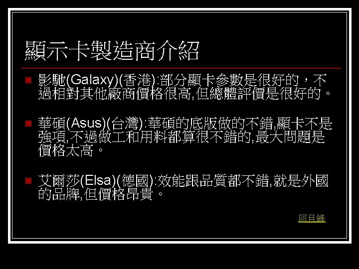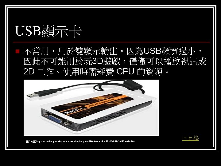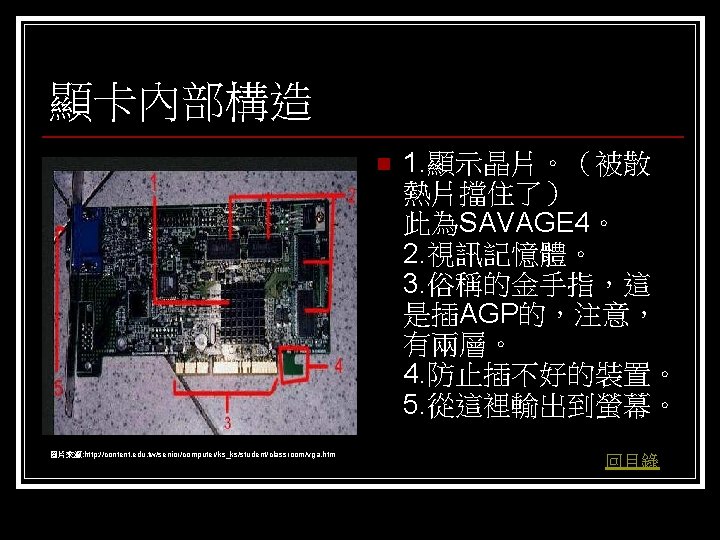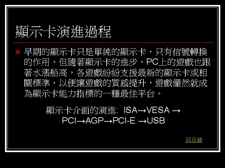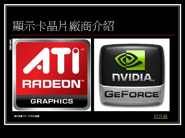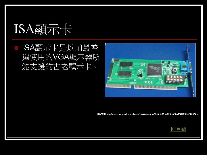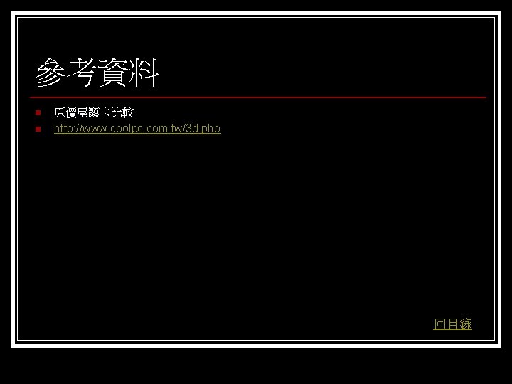 參考資料 聯合新聞網 http: //mag. udn. com/mag/digital/shdoc. jsp? f_KW=%C 5%E 3%A 5%DC%A 5 d&Keywor ds=&udn=radiobutton n 維基百科 http: //zh. wikipedia. org/w/index. php? title=%E 9%A 1%AF%E 7%A 4%BA%E 5%8 D%A 1 &variant=zh-tw#ISA. E 6. 98. BE. E 5. 8 D. A 1 n Tom’s 硬體 http: //www. tomshardware. tw/ n D-CROSS. com http: //www. d-cross. com/ 其他 http: //www. mobile 01. com/topicdetail. php? f=298&t=1089514&last=12523790 http: //eservice. puiching. edu. mo/wiki/index. php/%E 9%A 1%AF%E 7%A 4%BA%E 5%8 D%A 1 http: //content. edu. tw/senior/computer/ks_ks/student/classroom/vga. htm n 回目錄