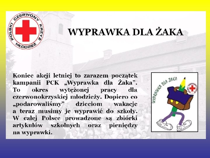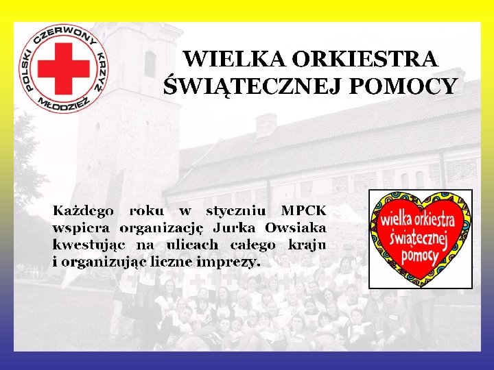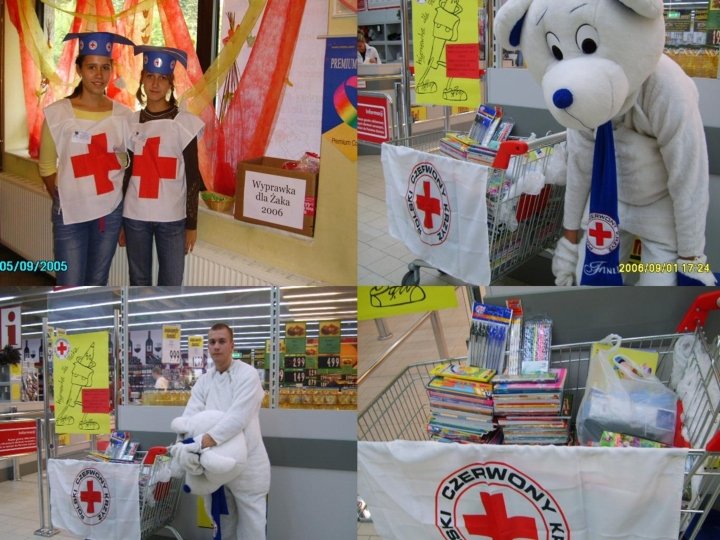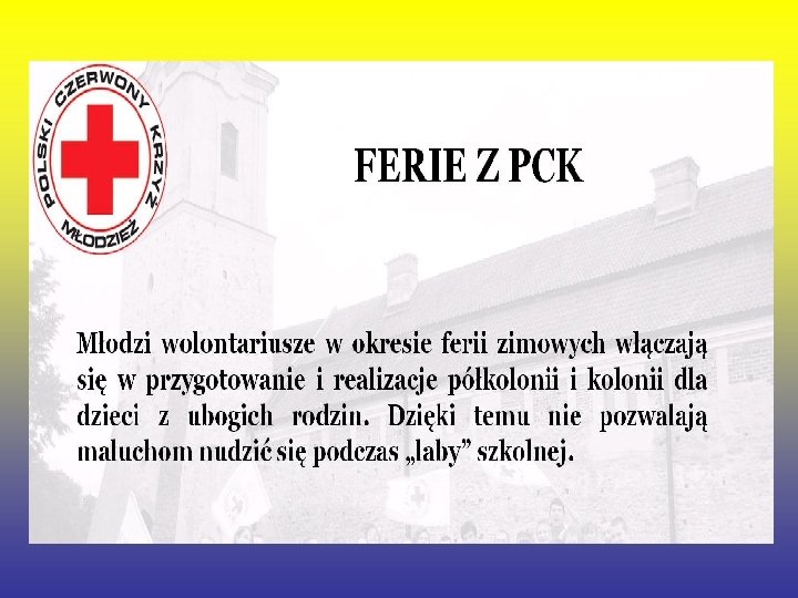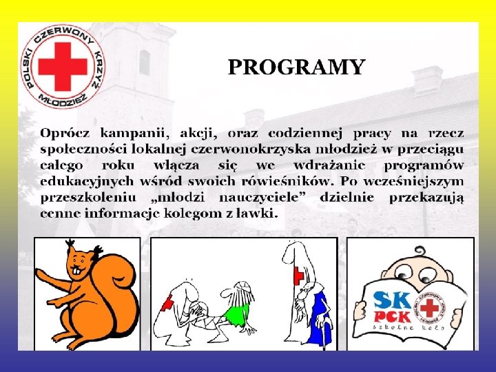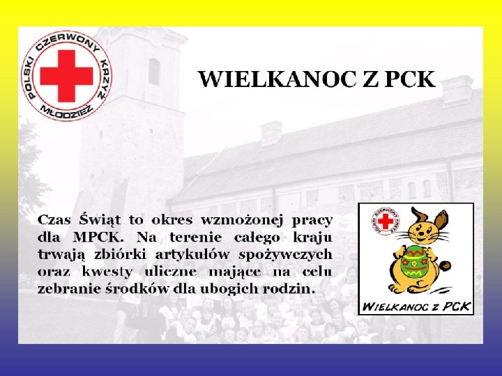 Czym zajmuje się PCK • • Główne kierunki działania obecnie to : Działania w zakresie opieki i pomocy Prowadzenie wśród młodzieży szkoleń w zakresie udzielania pierwszej pomocy Pozyskiwanie honorowych dawców krwi Uczestnictwo w Miedzynarodwych Ruchach Czerwonego Krzyża.