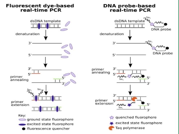 Real-Time PCR: Chemistry of Foster Resonance Energy Transfer (FRET) ü Probe-based Taq. Man, Molecular beacons, Scorpions ü Non-Probe based SYBR Stokes shift is the diff. (in wavelength or frequency units) b/t positions of the band maxima of the absorption & emission spectra of the same electronic transition (e. g. , fluorescence & Raman spectra)
