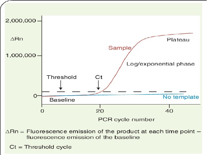 Quantification in q. RT-PCR üAmplification plot: Display of data collected during cycling stage of PCR amplification üBaseline: A line fit to the fluorescence levels during the initial stages üThreshold: Level of fluorescence above the baseline & within exponential phase üCycle threshold: PCR cycle no. at which fluorescence meets the threshold