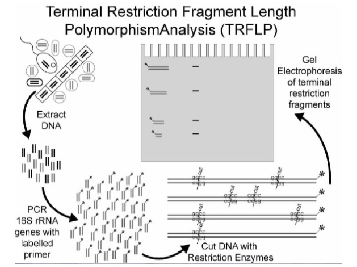 RFLP • DNA can be processed by RFLP either directly (if you can get enough DNA from an environment) or from PCR product • T-RFLP (terminal-RFLP) is in most respects identical except for a marker on the end of the enzyme • Works as fingerprinting technique because different organisms with different DNA sequences will have different lengths of DNA between identical units targeted by the restriction enzymes – specificity can again be manipulated with PCR primers Liu et al. (1997) Appl Environ Microbiol 63: 4516 -4522