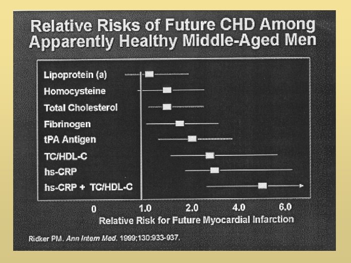 PCR Y EC • Parece necesario añadir un marcador de inflamación a la predicción de riesgo de EC en sujetos sanos o sin otros datos clínicos o de laboratorio, o de progresión en sujetos en cualquier etapa de EC • PCR es el más asequible de los RFA • PCR es más fuerte que dislipemias • PCR predice en sujetos con lípidos normales • Niveles de PCR : estables, específicos de inflamación, independientes de otros factores, en hombres y mujeres, ancianos o no
