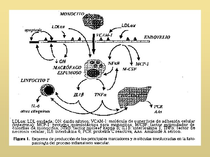 1. Disfunción endotelial : • La LDLox induce una alteración endotelial que consiste : -en la interrupción en la producción de ON (Óxido Nítrico) -en la muerte apoptótica de células endoteliales • El ON provoca: -Vasodilatación -Inhibe activación y agregación plaquetaria -Refuerza barrera endotelial como protectora de la pared vascular: De este modo, impide la expresión de receptores de adhesividad celular en la superficie endotelial y dificulta el paso de células inflamatorias circulantes a través del endotelio. • Por tanto , cuando disminuye la producción de ON : - la adhesividad - la migración celular a través del endotelio - Aparición de huecos en la superficie interna vascular a causa de la apoptosis de las células endoteliales