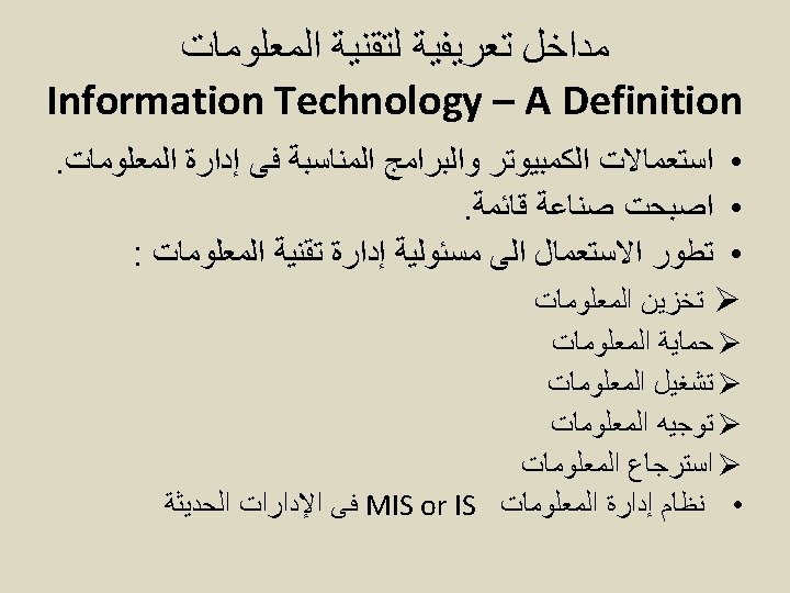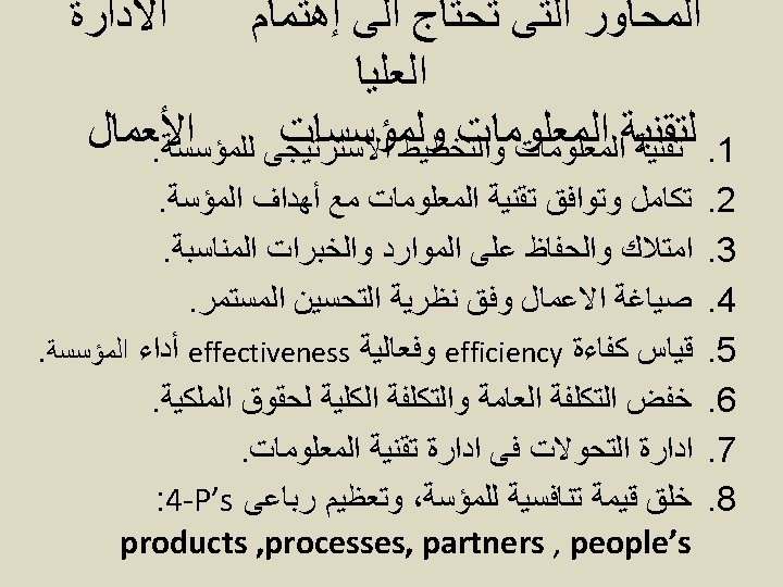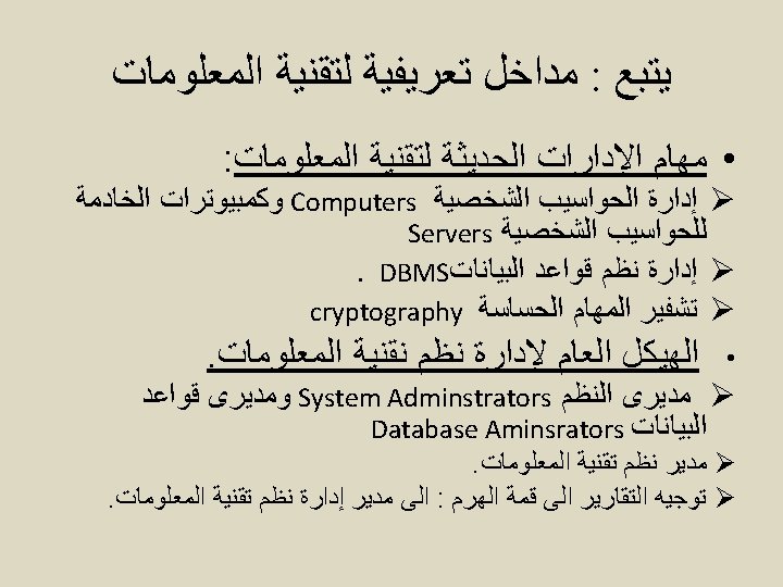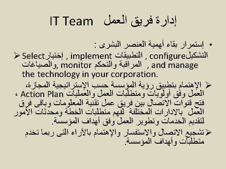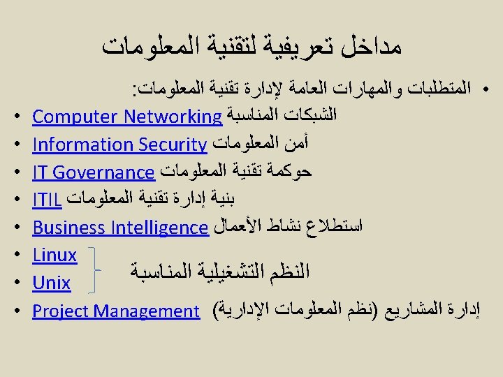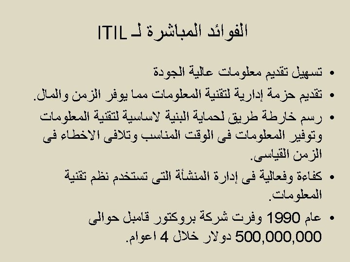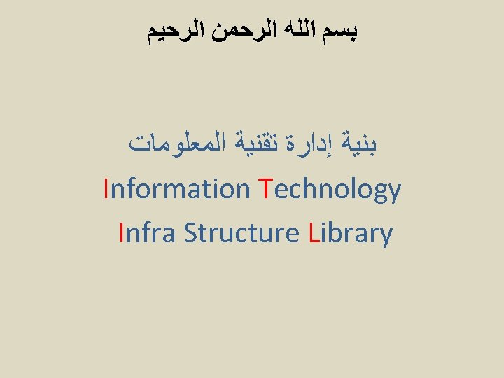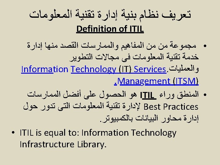ITIL framework ﺍﻟﻤﺤﺎﻭﺭ ﺍﻟﻌﻤﻠﻴﺔ • ITIL framework consists of seven disciplines: 1. Service Delivery 2. Service Support 3. ICT Infrastructure Management 4. Planning to Implement Service Management 5. Application Management 6. The Business Perspective 7. Security Management.