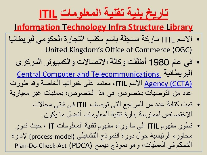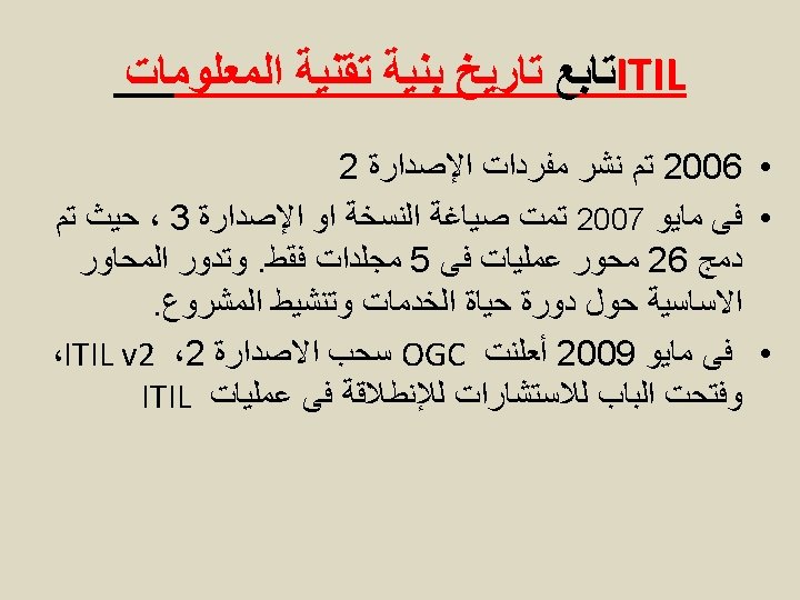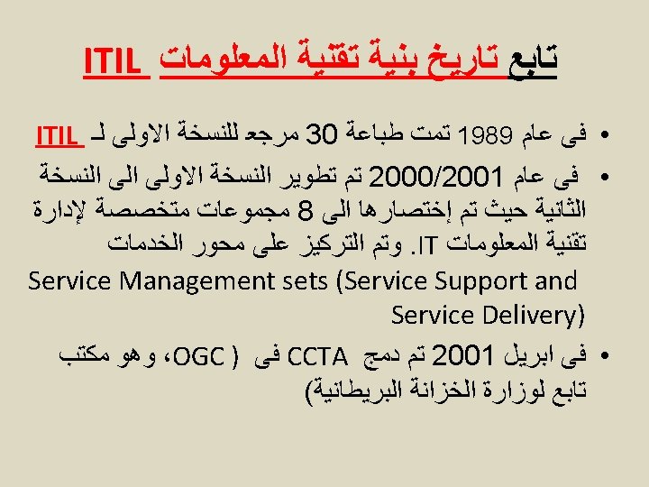 ﺍﻟﺘﺎﺭﻳﺨﻴﺔ ITIL ﻣﺤﺎﻭﺭ • • • 1 - Service Strategy 2 - Service Design 3 - Service Transition 4 -Service Operation 5 - Continual Service Improvement (CSI)