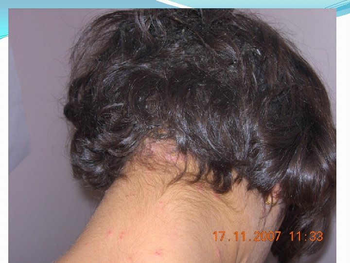 Pédiculose du cuir chevelu �Elle est due à pediculus humanus, variéte capitis, �Touche essentiellement les enfants d’âge scolaire �Le symptôme initial est le prurit+++, prédominant aux régions rétroauriculaires et occipitales. �Possibilité d’impétiginisation avec adénopathies occipitales