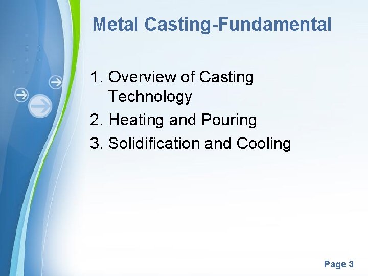 Metal Casting-Fundamental 1. Overview of Casting Technology 2. Heating and Pouring 3. Solidification and Cooling Powerpoint Templates Page 3