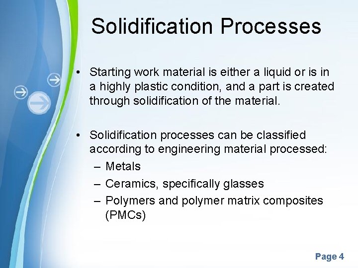 Solidification Processes • Starting work material is either a liquid or is in a highly plastic condition, and a part is created through solidification of the material. • Solidification processes can be classified according to engineering material processed: – Metals – Ceramics, specifically glasses – Polymers and polymer matrix composites (PMCs) Powerpoint Templates Page 4