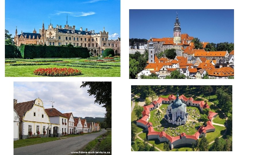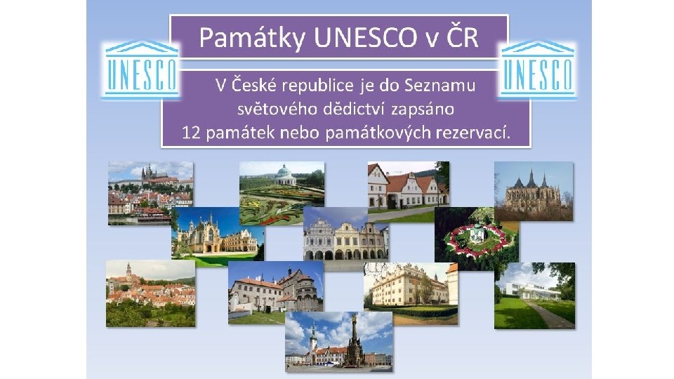 SÍDLA - většina obyvatel ČR (více než 70 %) žije ve městech – pracují ve službách, dopravě a průmyslu - na vesnicích obyvatelé pracují často v zemědělství nebo za prací dojíždějí - města s více než 100 000 obyv. = velkoměsta (Brno, Ostrava, Plzeň, Olomouc), města s počtem obyv. nad 1 000 = světová velkoměsta – u nás pouze Praha - ČR má hustou síť sídel – mají obytnou, pracovní a obslužnou funkci - města – hodně možností, ale zhoršené životní prostředí - městské památkové rezervace - nejcennější historické architektonické památky v Seznamu světového kulturního dědictví UNESCO (12 památek)
