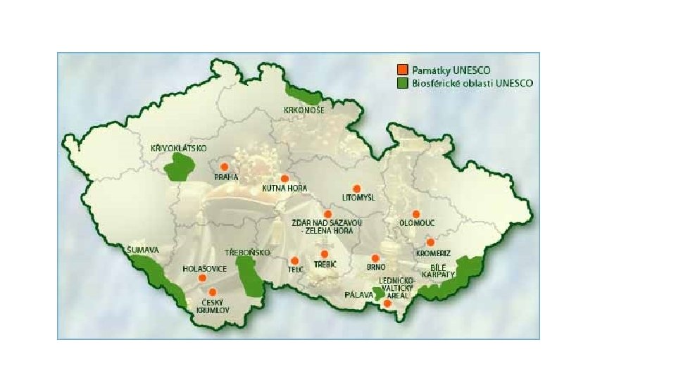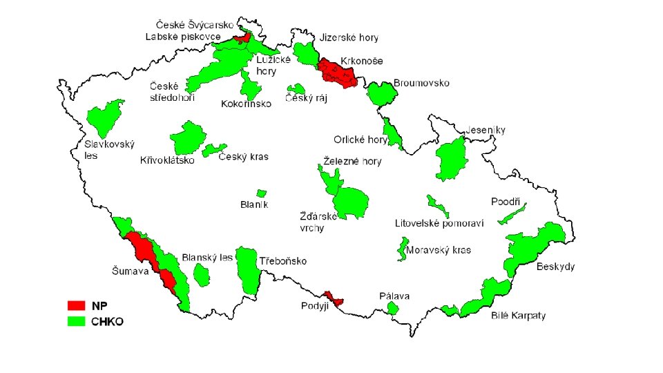 NÁRODNÍ PARKY - celkem je chráněno víc než 15 % území ČR - 4 NP: Krkonošský národní park (KRNAP) NP ŠUMAVA NP PODYJÍ NP ČESKÉ ŠVÝCARSKO CHRÁNĚNÉ KRAJINNÉ OBLASTI (CHKO) – 25 (Křivoklátsko, Šumava, Český ráj…) BIOSFÉRICKÉ REZERVACE UNESCO – 6 (Krkonoše, Křivoklátsko, Šumava, Třeboňsko, Dolní Morava, Bílé Karpaty)