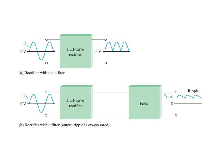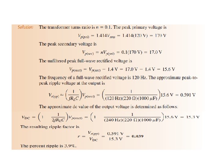 For a full-wave rectifier with a capacitor-input • filter, approximations for the peak-topeak ripple voltage, Vr(pp), and the dc value of the filter output voltage, VDC, are given in the following equations. The variable Vp(rect) is the unfiltered peak rectified voltage. Notice that if RL or C increases, the ripple voltage decreases and the dc voltage increases.