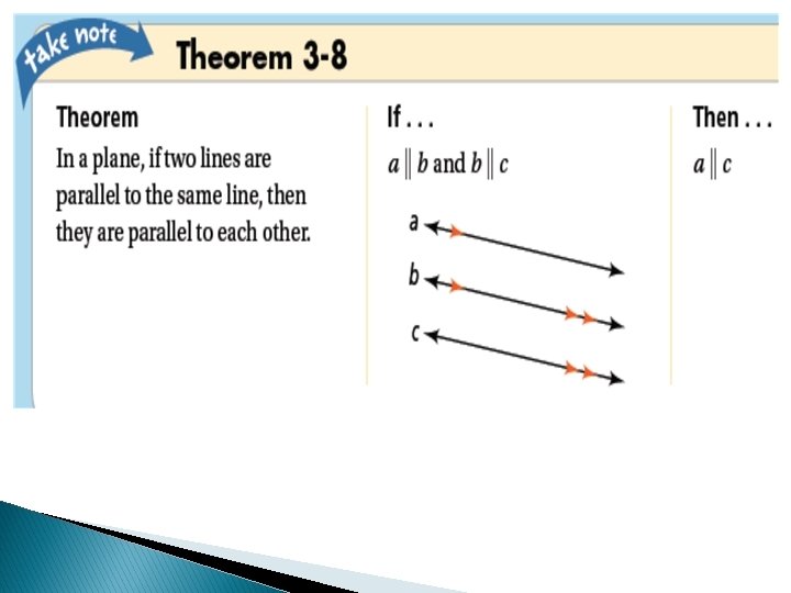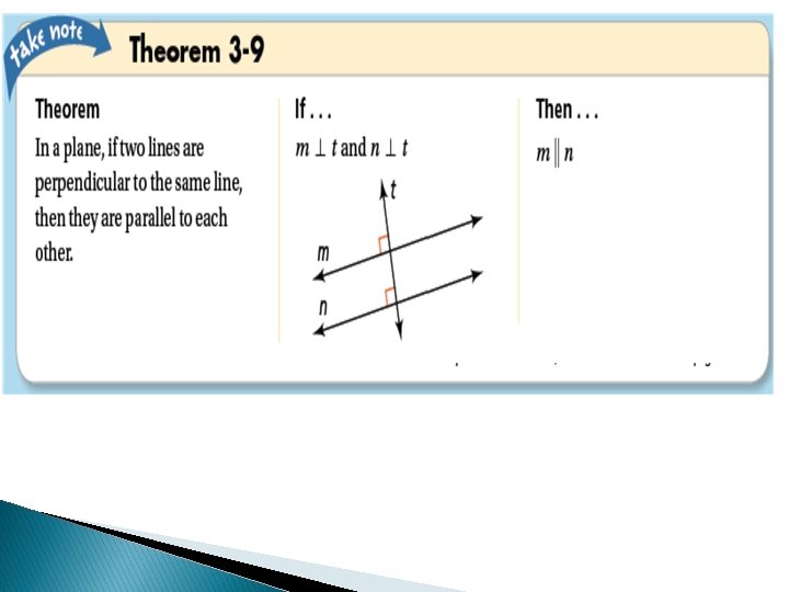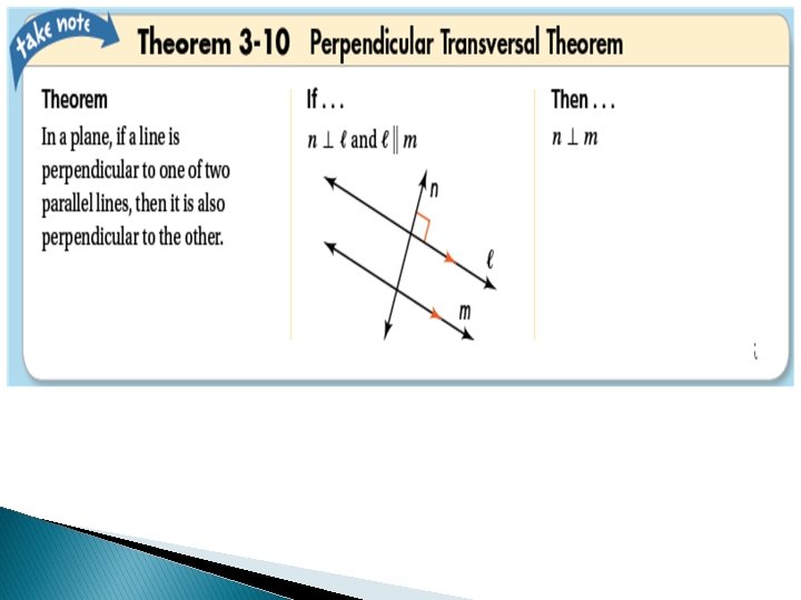 Example: 3 A carpenter’s square forms a right angle. A carpenter places the square so that one side is parallel to an edge of a board, and then draws a line along the other side of the square. Then he slides the square to the right and draws a second line. Why must the two lines be parallel? Both lines are perpendicular to the edge of the board. Theorem: If two coplanar lines are perpendicular to the same line, then the two lines are parallel to each other.