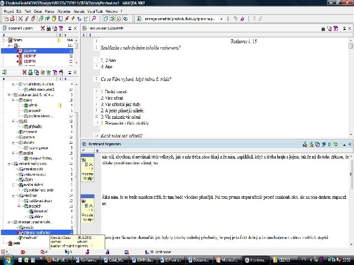 Analýza rozhovorů • Rozhovory přepsány do textu a analyzovány za pomocí software MAXQDA 2007 • Kódování textu (zakotvená teorie) – identifikace významových jednotek – pojmenování význ. jednotek kódy – kategorizace kódů – pojmenovávání vztahů mezi kategoriemi