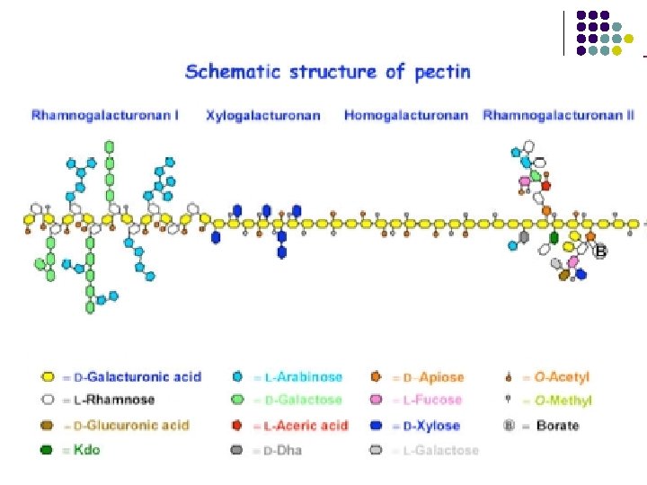 Pectina l Es un éster metilado del ácido poligalacturónico, y consiste de cadenas de 300 a 1000 unidades de ácido galacturónico conectadas por enlaces 1α→ 4.