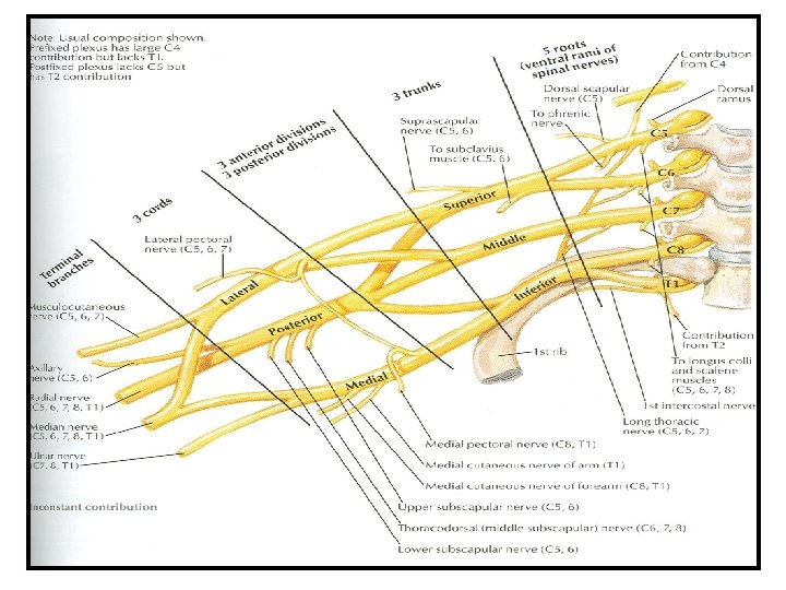 Lateral cord- 3 Medial cord- 5 Posterior cord- 5 Lateral pectoral nerve. Medial pectoral nerve. Axillary nerve. Musculocutaneous nerve. Ulnar nerve. Radial nerve. Median nerve (lateral root). Median nerve (medial root). Medial cutaneous nerve of arm & forearm. Upper & lower subscapular nerves. Thoracodorsal or N. to latissimus dorsi. B R N C H E S